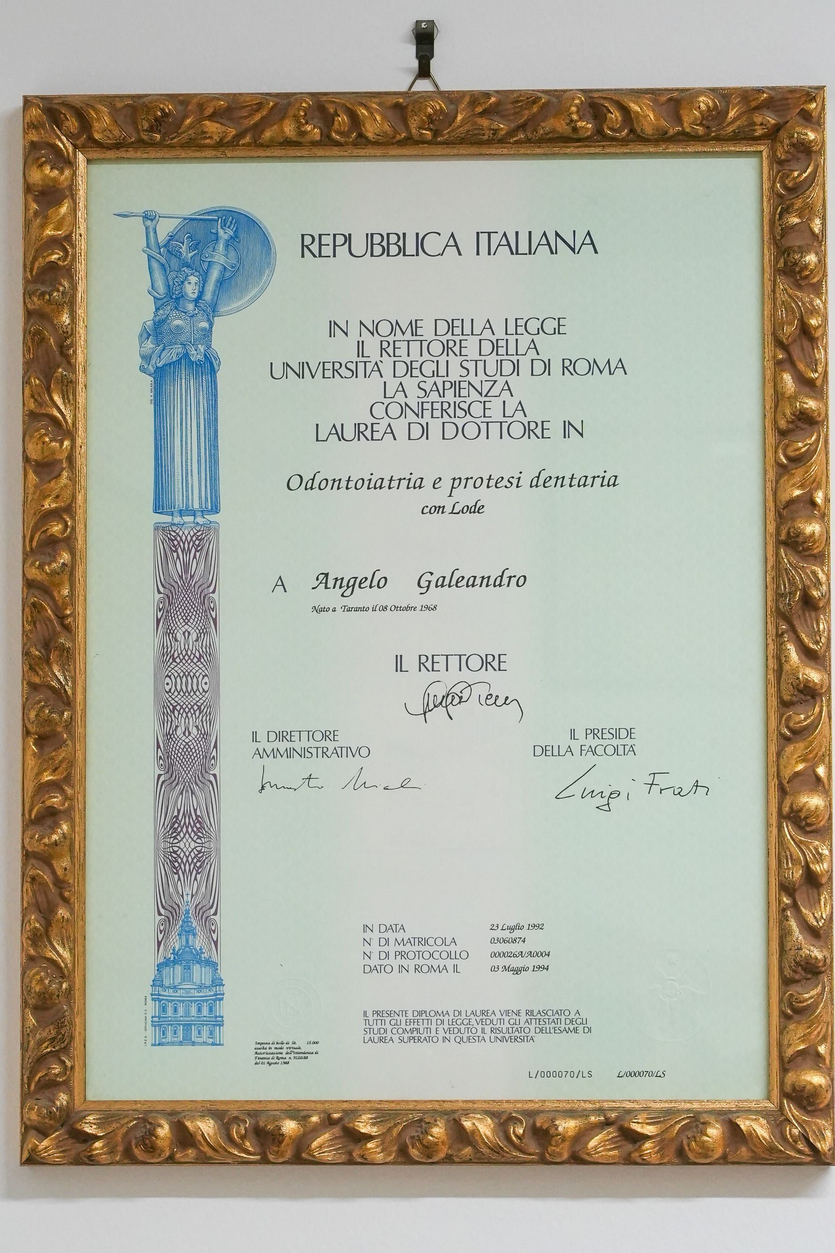 Lo studio del Dr. Angelo Galeandro si trova a Taranto, in Via Plateja 55/A, dove ogni giorno ogni paziente trova una soluzione specifica per le problematiche e patologie individuate. Il Dr. Angelo Galeandro è un dentista professionista laureato alla Sapienza e specializzato in Implantologia, Endodonzia e Chirurgia Orale. Lo studio di Taranto è aperto alle visite dal lunedì al venerdì, dalle ore 8:30 alle 13:00 la mattina e dalle 16:30 alle 20:00 il pomeriggio: chiama ora per informazioni o per prenotare una visita con uno specialista in odontoiatria e ortodonzia cortese e attento alle esigenze di ogni singolo paziente!